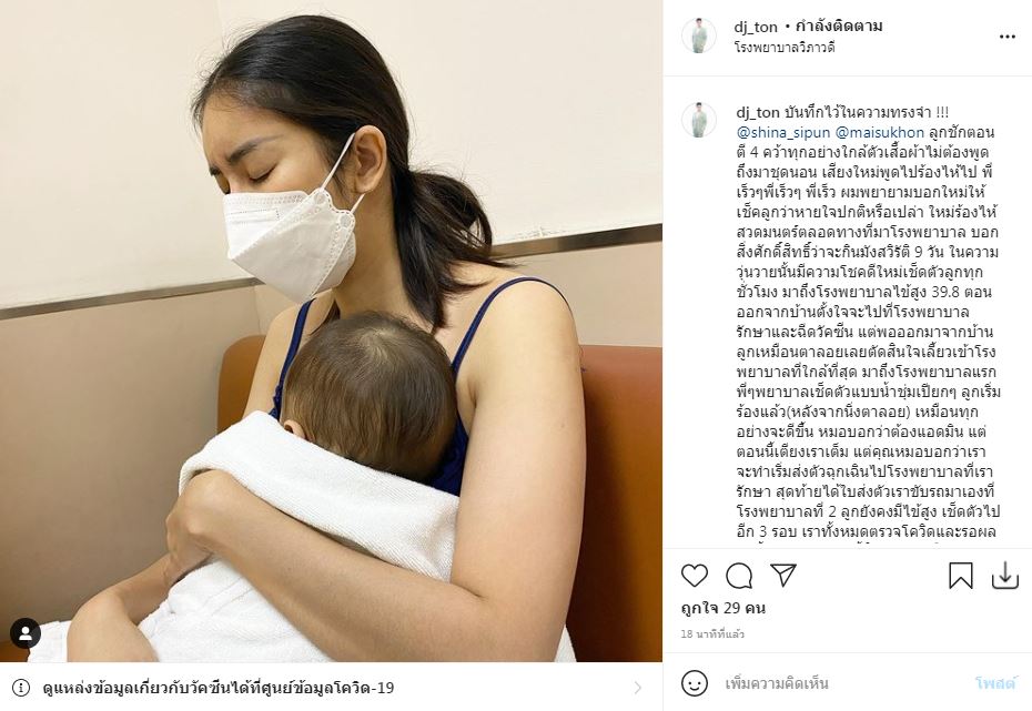 พร้อมระบุข้อความไว้ว่า "ลูกชายยังอยู่ รพ. นะคะ วันนี้คืนที่ 3 ละค่ะ เมื่อวานไข้สูงนิดหน่อย 37.9 องศา เช็ดตัวไปตามระเบียบ กันชัก แต่ถือว่าไข้ลงกว่าทุกวันค่ะ คุณหมอ บอกว่า ลูกเป็น "ไข้ชัก" นะคะ เป็นโรคกรรมพันธุ์ มาจากฝั่งสามีค่ะ จะหายเองตอน 7 ขวบ ถ้าเคยชักครั้งแรกแล้ว มีโอกาสชักอีกตลอดไป เวลามีไข้ค่ะ และด้วยความที่น้องมีโรค G6PD ประจำตัวด้วย จะยิ่งชักง่ายค่ะ ขอบคุณทุกคนมากนะคะ