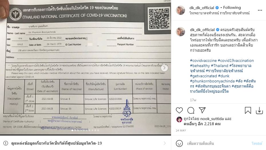 หลังจากได้เคยออกมาเผยประสบการณ์ ในการเข้ารับวัคซีน ของนักร้อง "ดัง พันกร" ที่เมื่อประมาณกลางปีที่ผ่านมา เจ้าตัวได้ออกมาโพสต์ถึงเรื่องราวการรับวัคซีน โดยได้เผยว่า "ครอบครัวสุขสันต์ครับ สุขภาพก็ต้องแข็งแรงเช่นกัน.. สะดวกเมื่อไหร่ อยากให้มารีบฉีดเลยนะครับ เพื่อตัวเราเองและคนที่เรารัก บอกเลยว่าฉีดสิวเจ็บกว่าเยอะครับ"