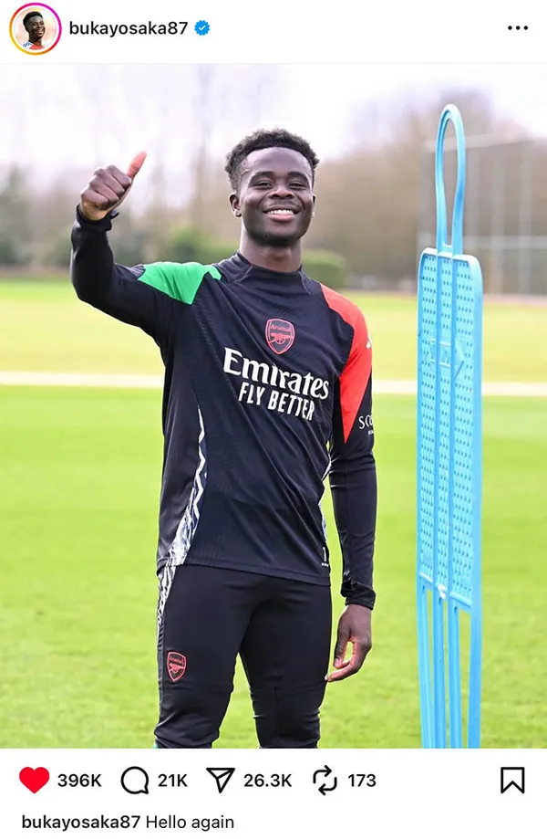 ทั้งนี้ ซาก้า กำลังพักรักษาตัวและเตรียมร่างกายเพื่อรอวันกลับมาลงสนามอีกครั้ง โดยล่าสุด เขาได้โพสต์รูปภาพพร้อมข้อความลงในอินสตาแกรมส่วนตัว เป็นรูปภาพชูนิ้วโป้งที่อยู่ในสนามซ้อมและระบุข้อความว่า "สวัสดีอีกครั้ง"