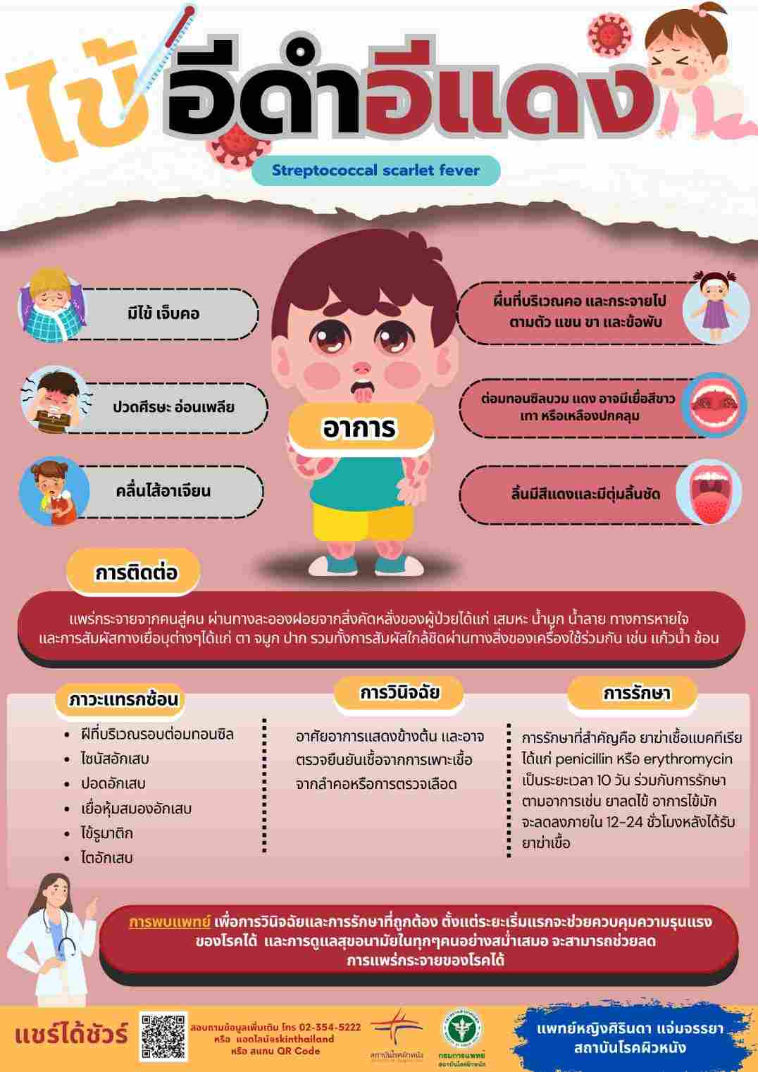 สถาบันโรคผิวหนัง กรมการแพทย์ แนะ โรคไข้อีดำอีแดง ( Streptococcal scarlet fever) เป็นโรคที่สามารถติดต่อได้หลายทาง ไม่ว่าจะเป็นการสัมผัส ทางเดินหายใจ ทำให้แพร่กระจายได้ง่ายประชาชนควรดูแลสุขอนามัยอย่างสม่ำเสมอเพื่อป้องกันตนเองจากการติดเชื้อ เนื่องจากโรคนี้ไม่สามารถหายได้เองทั้งยังมีภาวะแทรกซ้อนที่อาจเป็นอันตรายถึงชีวิต ดังนั้นเมื่อมีอาการแสดงที่ผิดปกติควรปรึกษาแพทย์ผู้เชี่ยวชาญ เพื่อรับการวินิจฉัยและการรักษาที่ถูกต้อง