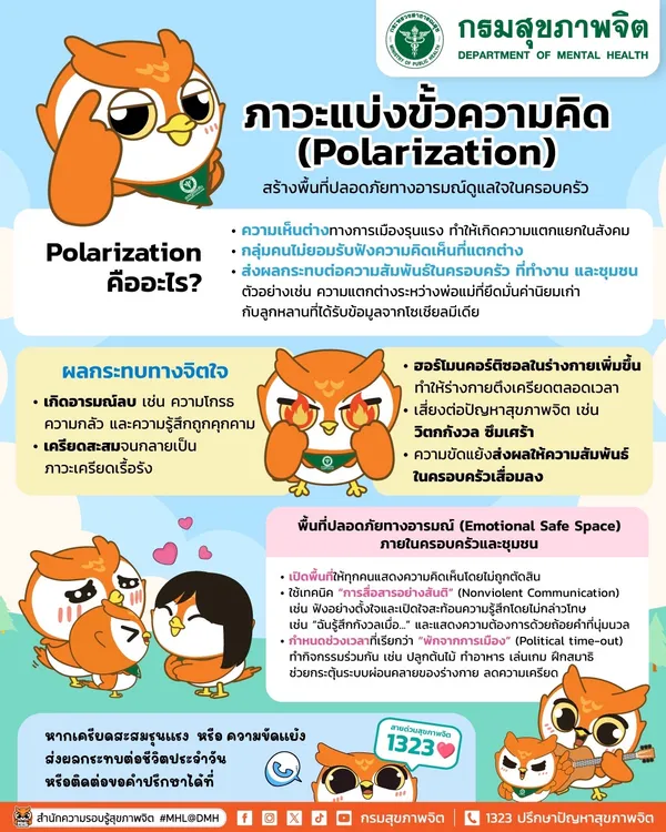 นายแพทย์กิตติศักดิ์ อักษรวงศ์ อธิบดีกรมสุขภาพจิต กล่าวว่า ในสถานการณ์ที่สังคมมีความเห็นต่างทางการเมืองอย่างรุนแรง เกิดภาวะ “การแบ่งขั้วทางความคิด” หรือ polarization อย่างกว้างขวาง ซึ่งเป็นปรากฏการณ์ที่ทำให้ความคิดและความเชื่อของกลุ่มคนในสังคมแตกแยกอย่างชัดเจน และมักไม่เปิดรับฟังความคิดเห็นที่แตกต่าง ส่งผลกระทบต่อความสัมพันธ์ระหว่างบุคคลในชีวิตประจำวัน ทั้งในที่ทำงาน ชุมชน และโดยเฉพาะในครอบครัว เนื่องจากแต่ละคนมีแหล่งข้อมูลและประสบการณ์ที่แตกต่างกัน โดยเฉพาะเมื่อต่างวัยมีแนวคิดทางการเมืองที่ขัดแย้งกัน เช่น พ่อแม่ที่ยึดมั่นในค่านิยมและประสบการณ์เดิม ขณะที่ลูกหลานได้รับข้อมูลจากโซเชียลมีเดียที่รวดเร็วและหลากหลายกว่า ส่งผลให้เกิดช่องว่างของกรอบความคิดและมุมมองต่อโลกที่แตกต่างกันอย่างมาก