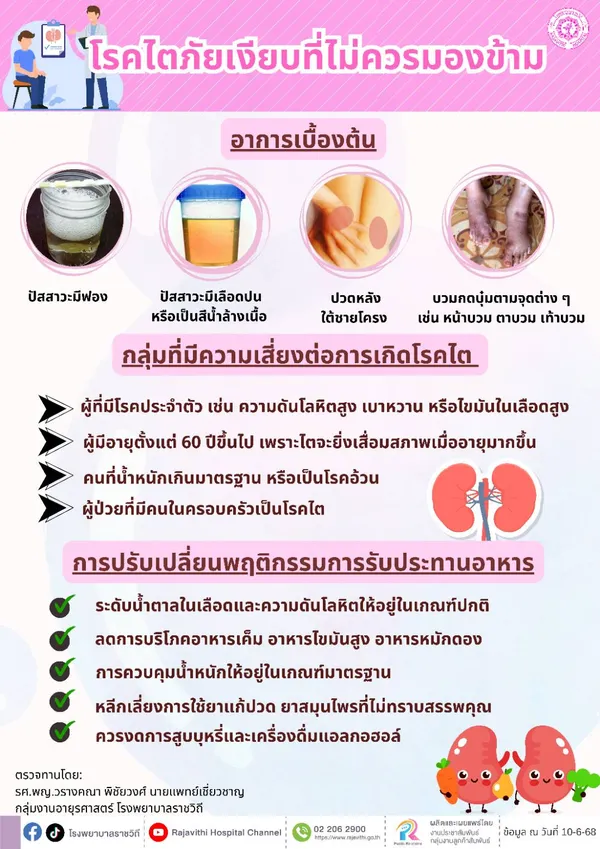นายแพทย์จินดา โรจนเมธินทร์ ผู้อำนวยการโรงพยาบาลราชวิถี กล่าวต่อว่า โรคไตเป็นปัญหาใหญ่ทั่วโลกในรอบหลายปีที่ผ่านมา สามารถเกิดขึ้นได้กับทุกเพศทุกวัย และคนไทยมีแนวโน้มป่วยโรคไตเพิ่มมากขึ้น หากไม่ได้รับการตรวจหาสาเหตุและการรักษาที่เหมาะสม อาจนำไปสู่การเกิดโรคไตเรื้อรังและเกิดภาวะแทรกซ้อนจากโรคตามมาได้ สัญญาณของโรคไตที่สำคัญคือ ตัวบวม เท้าบวม เหนื่อยง่าย อ่อนเพลีย ปวดหลัง ปวดบั้นเอว ปัสสาวะมีฟอง ปัสสาวะมีเลือดปนหรือเป็นสีน้ำล้างเนื้อ รวมถึงมีความดันโลหิตสูงมาก จึงต้องมีการตรวจสุขภาพประจำปี เพื่อหาความเสี่ยงของโรคไตในระยะเริ่มต้น เพื่อให้รักษาได้ทันท่วงทีและหลีกเลี่ยงพฤติกรรมเสี่ยง ที่อาจทำให้ประสิทธิภาพการทำงานของไตลดลง