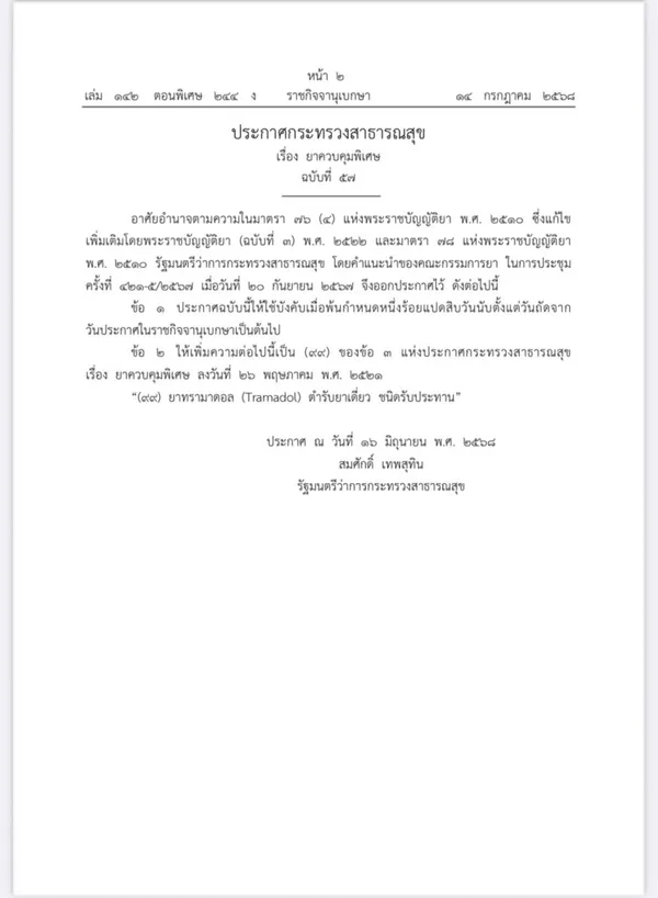 ทั้งนี้ เว็บไซต์ราชกิจจานุเบกษาเผยแพร่ประกาศกระทรวงสาธารณสุข เรื่อง ยาควบคุมพิเศษ ฉบับที่ 57 ลงนามโดยนายสมศักดิ์ เทพสุทิน รมว.สาธารณสุข เมื่อวันที่ 16 มิ.ย.2568