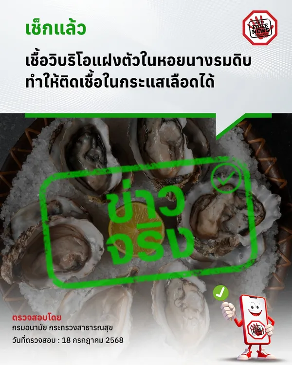 ศูนย์ต่อต้านข่าวปลอม "Anti-Fake News Center Thailand" ได้โพสต์เตือนผู้ที่ชอบรับประทานหอยนางรมดิบ อาจนำไปสู่ภาวะติดเชื้อในกระแสเลือดได้ โดยระบุว่า