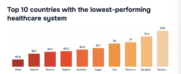 3 อันดับ ประเทศสาธารณสุขย่ำแย่ที่สุดในโลก ได้แก่ เวเนซูเอลา ซึ่งอยู่ในอันดับสุดท้ายของตาราง ได้คะแนนไปเพียง 67.8 คะแนน ตามมาด้วย บังคลาเทศ รองบ๊วย และ โมร็อกโก โดยสาเหตุมาจากปัญหาเศรษฐกิจและความไม่มั่นคงทางการเมือง ทำให้เกิดการขาดแคลนยาและอุปรณ์ รวมถึงค่าใช้จ่ายในการดูแลบุคลากรไม่ทั่วถึง