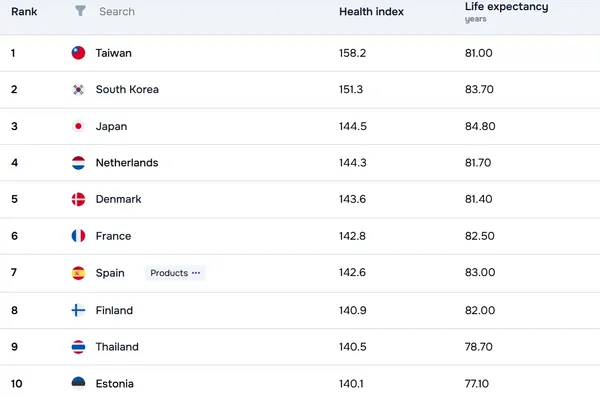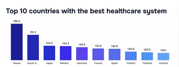 ไต้หวัน มีคะแนนนำมาเป็นอันดับ 1 ที่ 158.2 คะแนน โดยมีโครงการประกันสุขภาพแห่งชาติช่วยให้เข้าถึงบริการที่จำเป็นทั้งหมดได้ในราคาประหยัด นอกจากนี้รัฐบาลยังริเริ่มการนำเทคโนโลยีล่าสุดมาใช้ในภาคการแพทย์ของรัฐ
