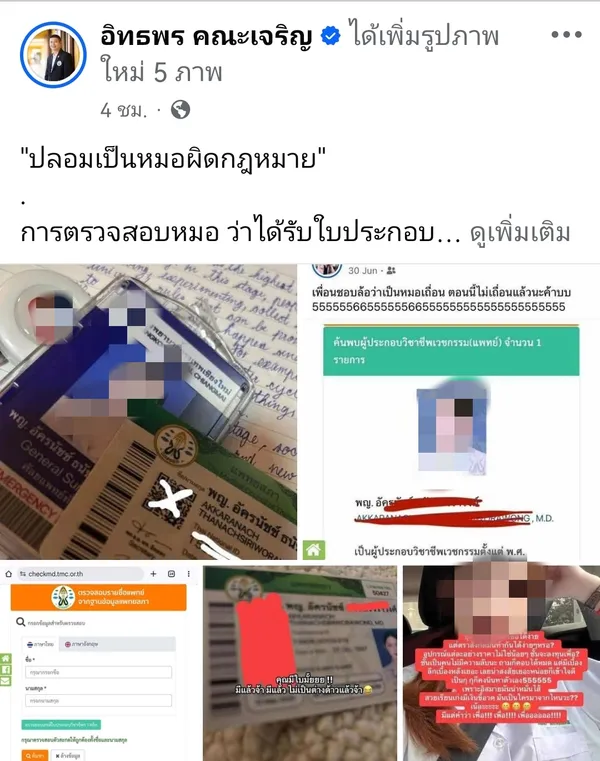 พล.อ.อ. นพ.อิทธพร คณะเจริญ เลขาธิการแพทยสภา โพสต์เฟซบุ๊ก "อิทธพร คณะเจริญ" ระบุว่า "ปลอมเป็นหมอผิดกฎหมาย"