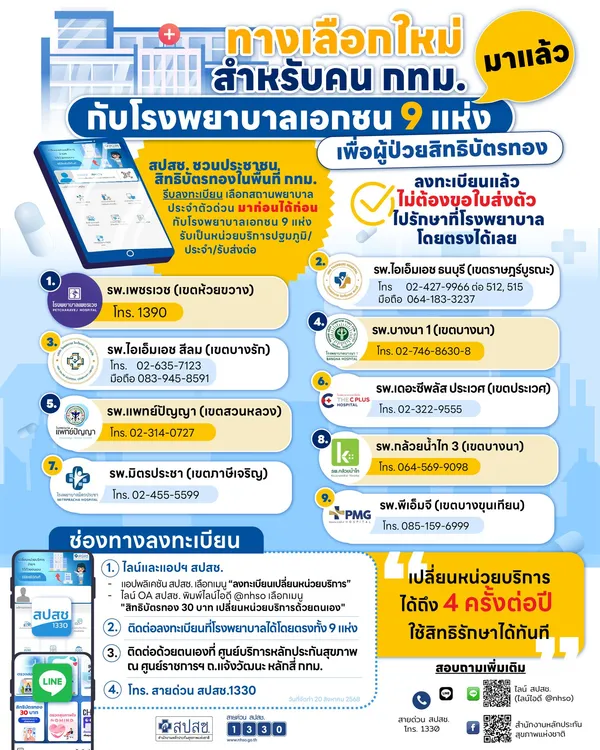 สำนักงานหลักประกันสุขภาพแห่งชาติ (สปสช.) เพิ่มทางเลือกใหม่สำหรับคน กทม. กับโรงพยาบาลเอกชน 9 แห่งเพื่อผู้ป่วยสิทธิบัตรทอง
