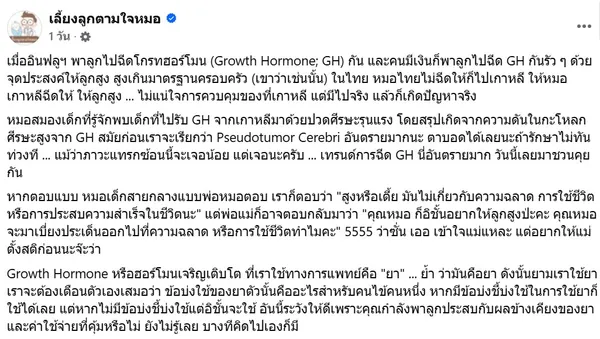 เฟซบุ๊กแฟนเพจ เลี้ยงลูกตามใจหมอ ได้โพสต์เตือนผู้ปกครองที่พาลูกไป ฉีดโกรทฮอร์โมน (Growth Hormone; GH) เพื่อเพิ่มความสูง ให้ระวังภาวะแทรกซ้อนที่อาจเกิดขึ้นได้ โดยระบุว่า
