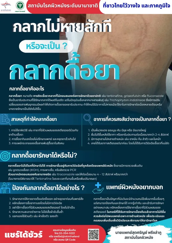 นายแพทย์วีรวัต อุครานันท์ ผู้อำนวยการสถาบันโรคผิวหนัง กล่าวเพิ่มเติมว่า กลากดื้อยาหมายความถึงการติดเชื้อรากลากที่ไม่ตอบสนองต่อการรักษาด้วยยาปกติ เช่น terbinafine, griseofulvin หรือ fluconazole ซึ่งเป็นยาที่ใช้ในรักษากลากได้ผลดีในอดีต แต่ในปัจจุบัน เชื้อกลากบางสายพันธุ์ เช่น Trichophyton indotineae ซึ่งมีการปรับเปลี่ยนของสารพันธุกรรมมีผลทำให้เกิดการดื้อยา ทำให้คนไข้มีอาการไม่หายแม้จะใช้ยาในการรักษาต่อเนื่องหลายเดือนหรือบางรายรักษาเป็นปียังไม่ดีขึ้น
