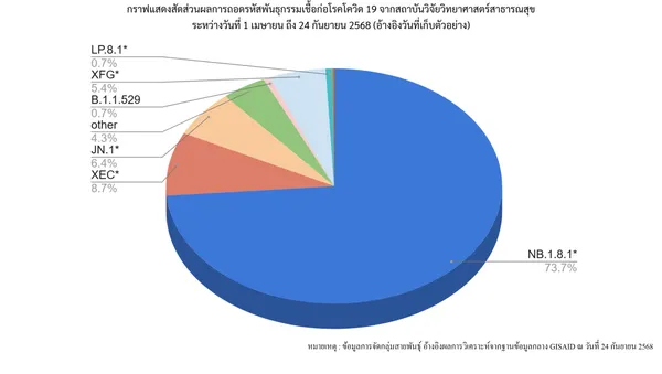ขณะเดียวกัน กรมวิทยาศาสตร์การแพทย์ ได้ถอดรหัสพันธุกรรมเชื้อโควิด 19 อย่างต่อเนื่อง โดยในช่วง 1 เมษายน – 24 กันยายน 2568 ได้ทำการถอดรหัสแล้ว 608 ตัวอย่าง พบว่าเป็น