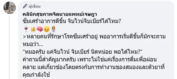 หลายคนที่รักษาโรคซึมเศร้าอยู่ พออาการเริ่มดีขึ้นก็มักจะถามหมอว่า “หมอครับ แค่จิบไวน์ จิบเบียร์ นิดหน่อย พอได้ไหม?”