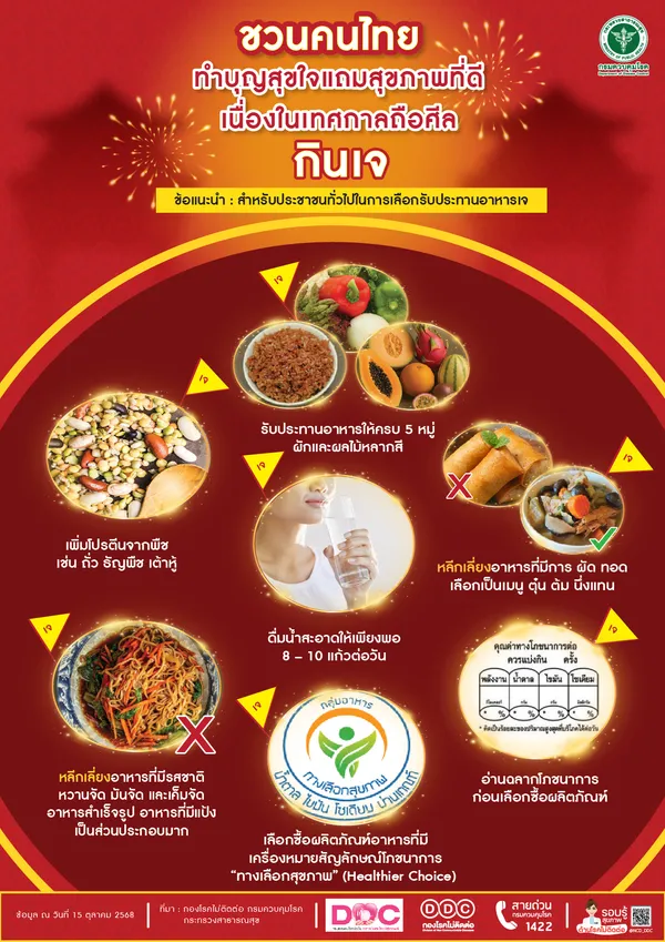 นายแพทย์กฤษฎา หาญบรรเจิด ผู้อำนวยการกองโรคไม่ติดต่อ กล่าวเพิ่มเติมว่า ประชาชนที่ต้องการกินเจควรเลือกอาหารที่มีคุณค่าทางโภชนาการ รับประทานอาหารให้ครบ 5 หมู่ ผักและผลไม้หลากสี ดื่มน้ำสะอาดให้เพียงพอ 8 – 10 แก้วต่อวัน เพิ่มโปรตีนจากพืช เช่น ถั่ว ธัญพืช เต้าหู้ ควรหลีกเลี่ยงอาหารที่มีรสชาติ หวานจัด มันจัด และเค็มจัด อาหารสำเร็จรูป อาหารที่มีแป้งเป็นส่วนประกอบมาก อาหารที่มีการ ผัด ทอด เลือกเป็นเมนู ตุ๋น ต้ม นึ่งแทน ระวังการได้รับโซเดียมเกิน 2,000 มิลลิกรัมต่อวัน โดยสามารถดูข้อมูลจากฉลากโภชนาการ และเลือกซื้อผลิตภัณฑ์อาหารที่มีเครื่องหมายสัญลักษณ์โภชนาการ “ทางเลือกสุขภาพ” (Healthier Choice)