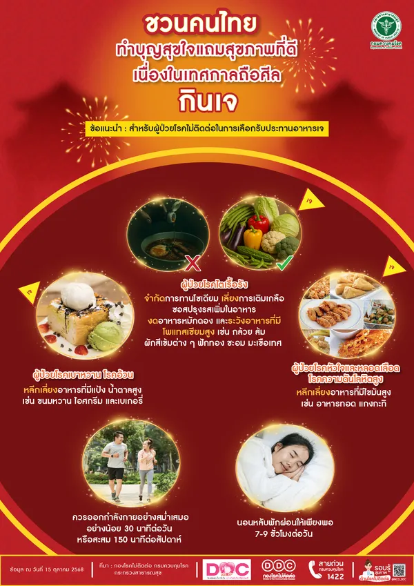 นายแพทย์สุทัศน์ โชตนะพันธ์ รองอธิบดีกรมควบคุมโรค กล่าวว่า ผู้ป่วยโรคไม่ติดต่อควรเลือกรับประทานอาหารเจที่ดีต่อสุขภาพ ตามหลัก 2:1:1 ผัก 2 ส่วน ข้าวกล้อง 1 ส่วน โปรตีนจากพืช 1 ส่วน เช่น ถั่ว โดยผู้ป่วยโรคเบาหวาน โรคอ้วน ควรหลีกเลี่ยงอาหารที่มีน้ำตาลสูง เช่น ขนมหวาน ไอศกรีม และเบเกอรี่ ผู้ป่วยโรคไตเรื้อรัง ควรจำกัดการทานโซเดียม เลี่ยงการเติมเกลือ ซอสปรุงรสเพิ่มเติมในอาหาร งดอาหารหมักดอง และระวังอาหารที่มีโพแทสเซียมสูง เช่น กล้วย ส้ม ผักสีเข้มต่าง ๆ ฟักทอง ชะอม มะเขือเทศ ผู้ป่วยโรคหัวใจและหลอดเลือด โรคความดันโลหิตสูง ควรหลีกเลี่ยงอาหารที่มีไขมันสูง เช่น อาหารทอด แกงกะทิ และควรออกกำลังกายสม่ำเสมออย่างน้อย 30 นาทีต่อวัน หรือสะสม 150 นาทีต่อสัปดาห์ นอนหลับพักผ่อนให้เพียงพอ เพื่อให้ผู้ป่วยโรคไม่ติดต่อสามารถทำบุญและมีสุขภาพที่ดีไปพร้อมกัน