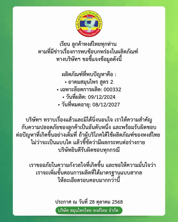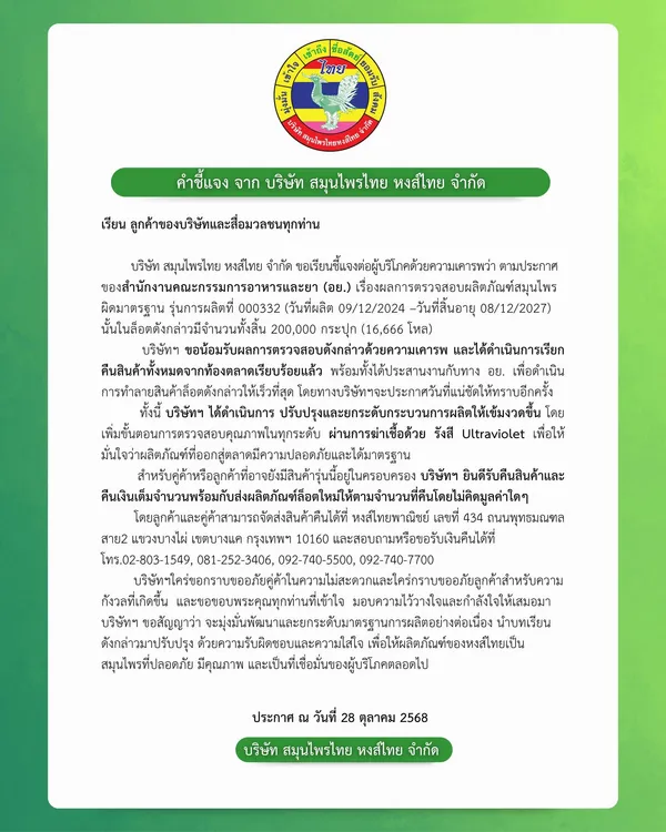 บริษัท สมุนไพรไทย หงส์ไทย จำกัด ขอเรียนชี้แจงต่อผู้บริโภคด้วยความเคารพว่า ตามประกาศ