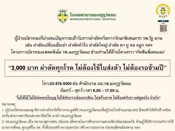 ได้ในราคาเหมาจ่ายเพียง "3,000 บาท ผ่าตัดทุกโรค ไม่ต้องใช้ใบส่งตัว ไม่ต้องรอข้ามปี"ตามสิทธิ์บัตรทอง