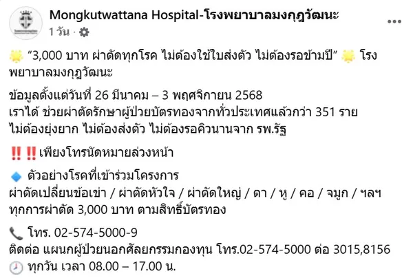 โดยระบุว่า “3,000 บาท ผ่าตัดทุกโรค ไม่ต้องใช้ใบส่งตัว ไม่ต้องรอข้ามปี” โรงพยาบาลมงกุฎวัฒนะ