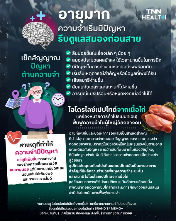 การดูแลสมองไม่ใช่เรื่องของผู้สูงอายุเท่านั้น แต่ควรเริ่มตั้งแต่ตอนที่ยังจำได้ดี เพราะเมื่อสมองเสื่อมแล้ว การฟื้นฟูจะทำได้ยาก สิ่งสำคัญ คือ การชะลอความเสื่อมของเซลล์สมอง และการเพิ่มสารอาหารที่ช่วยให้สมองทำงานเต็มประสิทธิภาพ ยกตัวอย่างเช่น ไฮโดรไลซ์เปปไทด์จากเนื้อไก่ (เครื่องหมายการค้าโปรเบปทิเจน) เป็นอีกทางเลือกหนึ่งที่มีการศึกษาวิจัยสนับสนุนว่ามีประโยชน์ในการฟื้นฟูความจำ