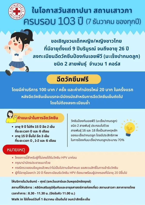 สถานเสาวสภา สภากาชาดไทย ชวนเด็กหญิง/หญิงชาวไทย ที่มีอายุตั้งแต่ 9 ปีบริบูรณ์ จนถึงอายุ 26 ปี ลงทะเบียนฉีดวัคซีนป้องกันเอชพีวี (มะเร็งปากมดลูก) ชนิด 2 สายพันธุ์ **จำนวน 1 คอร์ส ฟรี!!!