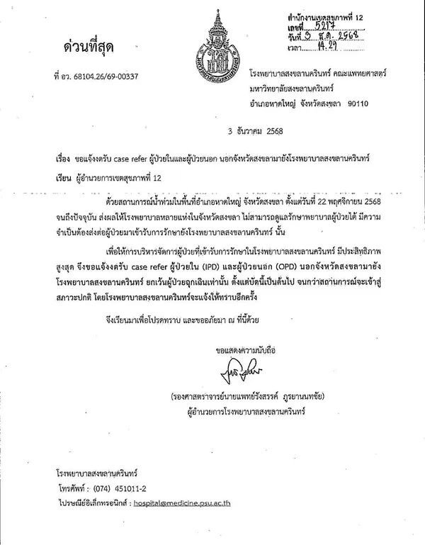 เนื่องจาก รพ.สงขลานครินทร์ คณะแพทยศาสตร์ มหาวิทยาลัยสงขลานครินทร์ จำเป็นต้องงดรับการส่งต่อ(refer) ทั้งผู้ป่วยนอกและผู้ป่วยในจากจังหวัดนอกเขตจังหวัดสงขลา ยกเว้นผู้ป่วยฉุกเฉินที่ยังคงส่งต่อได้ตามปกติ ตามหนังสือที่แนบ ลงวันที่ 3 ธ.ค.68