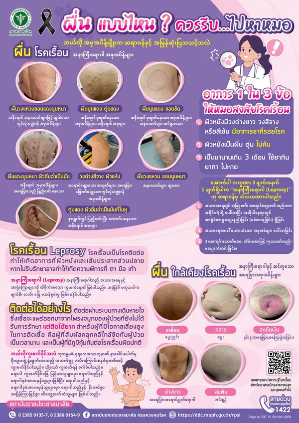 วันนี้ (12 มกราคม 2569) นายแพทย์มณเฑียร คณาสวัสดิ์ อธิบดีกรมควบคุมโรค กล่าวว่า เนื่องใน “วันราชประชาสมาสัย” 16 มกราคม ของทุกปี ซึ่งเป็นวันน้อมรำลึกในพระมหากรุณาธิคุณ และสืบสานพระราชปณิธาน “การกำจัดโรคเรื้อน” ของพระบาทสมเด็จพระบรมชนกาธิเบศร มหาภูมิพลอดุลยเดชมหาราช บรมนาถบพิตร ที่ทรงก่อตั้งสถาบันราชประชาสมาสัย เพื่อผลิตบุคลากรและค้นคว้าวิจัยเกี่ยวกับโรคเรื้อน กระทรวงสาธารณสุขได้จัดให้มีสัปดาห์รณรงค์ค้นหาผู้ป่วยรายใหม่ทั่วประเทศ ระหว่างวันที่ 12 - 18 มกราคม 2569 และสร้างความตระหนักรู้เกี่ยวกับโรคเรื้อน ให้ประชาชนสามารถสังเกตอาการของตนเองและคนใกล้ชิด ให้เข้ามารับการตรวจรักษาอย่างรวดเร็ว เพื่อลดความพิการที่อาจเกิดขึ้นได้