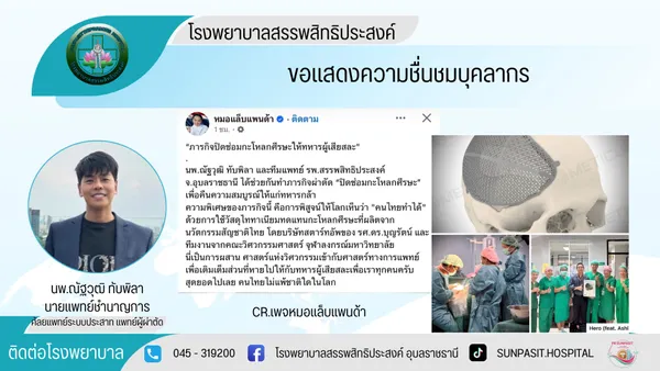 นพ.ณัฐวุฒิ ทับพิลา และทีมแพทย์ รพ.สรรพสิทธิประสงค์ จ.อุบลราชธานี ได้ช่วยกันทำภารกิจผ่าตัด “ปิดซ่อมกะโหลกศีรษะ” เพื่อคืนความสมบูรณ์ให้แก่ทหารกล้า