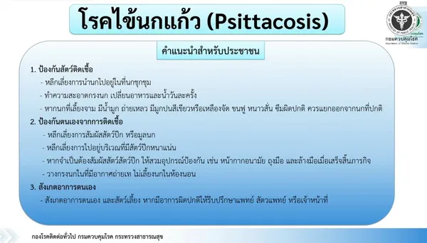 วันที่ 23 มกราคม 2569 นพ.วีรวัฒน์ มโนสุทธิ นายแพทย์ทรงคุณวุฒิ และโฆษกกรมควบคุมโรค ได้เปิดเผยในการแถลงข่าว ปีใหม่วิถีใหม่ ใส่ใจป้องกัน ห่างไกลโรคและภัยสุขภาพ ว่า มีโรคจากสัตว์สู่คน ที่เรียกว่า โรคไข้นกแก้ว มาเตือนประชาชน โรคนี้เกิดจากเชื้อแบคทีเรีย จากนกแก้วสู่คนเลี้ยง แต่พบได้ในนกพิราบ เป็ด ไก่งวง เป็นต้น ปัจจุบันพบรายงานการระบาดในประเทศแถบยุโรป