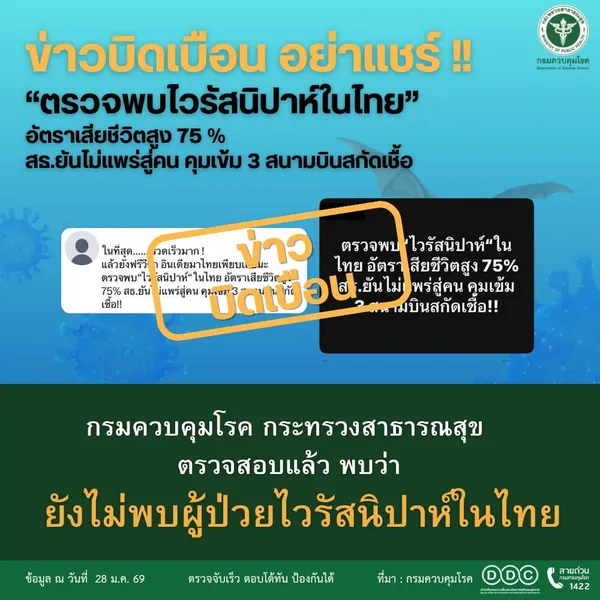 ข่าวบิดเบือน อย่าแชร์ กรมควบคุมโรค กระทรวงสาธารณสุข ตรวจสอบแล้ว พบว่า ยังไม่พบผู้ป่วยไวรัสนิปาห์