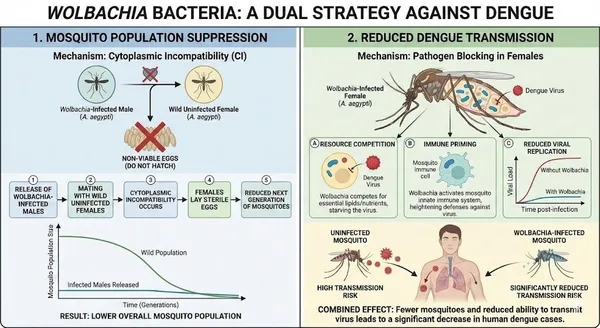 อย่างไรก็ตาม ในวงการวิทยาศาสตร์ยังมีอีกหนึ่งแนวทางที่ใช้ประโยชน์จากเชื้อวูลบาเกีย นั่นคือบทบาทของ "ยุงตัวเมีย" แม้ว่าการศึกษาในสิงคโปร์จะเน้นใช้ยุงตัวผู้เพื่อลดจำนวนประชากร แต่โดยธรรมชาติแล้วหาก ยุงตัวเมียมีเชื้อวูลบาเกีย แบคทีเรียชนิดนี้จะเข้าไปแย่งชิงทรัพยากรในตัวยุงจนทำให้เชื้อไวรัสไข้เลือดออก (รวมถึงไวรัสซิกาและชิคุนกุนยา) ไม่สามารถเจริญเติบโตหรือเพิ่มจำนวนได้ ส่งผลให้ยุงตัวเมียนั้น "เป็นหมันต่อเชื้อไวรัส" คือกัดคนได้แต่ไม่แพร่โรค ซึ่งเป็นหลักการของวิธี "การแทนที่ประชากรยุง" (Population Replacement) ที่ใช้ในบางประเทศ เช่น อินโดนีเซีย แต่สำหรับโมเดลของสิงคโปร์ในงานวิจัยชิ้นนี้ ได้เลือกใช้วิธีการปล่อยเฉพาะยุงตัวผู้เพื่อเน้นผลลัพธ์ในการ "ลดจำนวนยุง" (Suppression) ให้เหลือน้อยที่สุดแทน