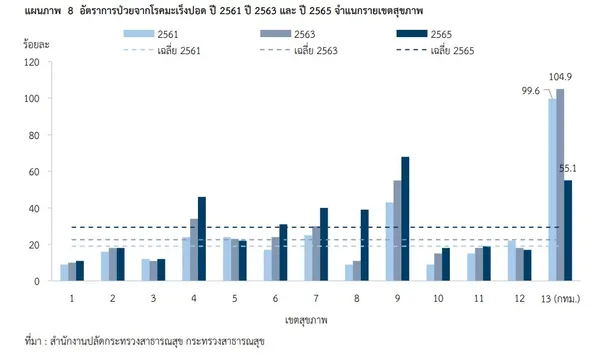 วิกฤตฝุ่นละอองขนาดเล็ก (PM2.5) กับการเพิ่มขึ้นของโรคมะเร็งปอด เขตสุขภาพที่ 13 (กรุงเทพมหานคร) มีอัตราป่วยโรคมะเร็งปอดในปี 2561 ปี 2563 และปี 2565 สูงกว่าเขตอื่นสุขภาพ อย่างมีนัยสำคัญ แม้ในปี 2565 อัตราป่วยจะลดลงเกือบครึ่งหนึ่ง แต่ยังคงสูงกว่าค่าเฉลี่ยประเทศที่ร้อยละ 29.4 เกือบสองเท่า