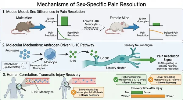 ความแตกต่างที่น่าสนใจของงานวิจัยนี้ คือการค้นพบว่าทำไมกระบวนการเยียวยาตามธรรมชาตินี้ถึงทำงานได้ดีกว่าในเพศชาย ทีมวิจัยพบว่าในหนูตัวผู้จะมีปริมาณของโมโนไซต์ชนิดที่ผลิตสาร IL-10 มากกว่าหนูตัวเมียอย่างเห็นได้ชัด ทั้งนี้ไม่ได้หมายความว่าหนูตัวผู้มีการอักเสบน้อยกว่า เพราะจากการวัดขนาดของแผลหรืออาการบวมพบว่าทั้งสองเพศมีระดับการอักเสบที่เท่ากัน แต่สิ่งที่ต่างกันคือ "ความเร็วในการหายปวด" สาเหตุหลักมาจากอิทธิพลของ "ฮอร์โมนเพศชาย" หรือแอนโดรเจน (Androgen) ซึ่งทำหน้าที่เป็นตัวกระตุ้นสำคัญที่สั่งการให้เซลล์โมโนไซต์ผลิตสารระงับปวด IL-10 ออกมาในปริมาณมาก การทดลองยืนยันสมมติฐานนี้อย่างชัดเจนเมื่อนักวิจัยลองยับยั้งการทำงานของฮอร์โมนนี้ในหนูตัวผู้ พบว่าพวกมันกลับมีอาการปวดที่ยาวนานขึ้นคล้ายกับเพศเมีย ในทางตรงกันข้าม เมื่อให้ฮอร์โมนดังกล่าวแก่หนูตัวเมีย พวกมันกลับสามารถฟื้นตัวจากความเจ็บปวดได้รวดเร็วขึ้นเทียบเท่ากับตัวผู้ แสดงให้เห็นว่าฮอร์โมนเพศเป็นตัวแปรสำคัญที่ควบคุมประสิทธิภาพของระบบระงับปวดภายในร่างกายนี้