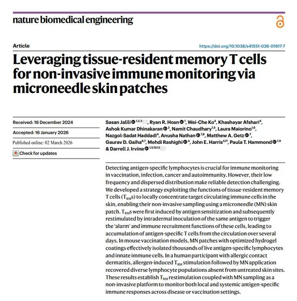 เมื่อวานนี้ ทีมนักวิจัยจากหลายสถาบันใน USA ได้ตีพิมพ์วิธีแก้ปัญหาดังกล่าวด้วยการพัฒนาเทคโนโลยีใหม่ที่ผสมผสานความรู้ด้านภูมิคุ้มกันวิทยาเข้ากับวิศวกรรมชีวการแพทย์ จนเกิดเป็น "แผ่นแปะผิวหนังเข็มไมโคร" (Microneedle Skin Patches) ที่สามารถดึงเซลล์ภูมิคุ้มกันออกมาตรวจได้โดยไม่ต้องเจาะเลือด และไม่สร้างความเจ็บปวดให้กับผู้ใช้แผ่นแปะนั้นเลย