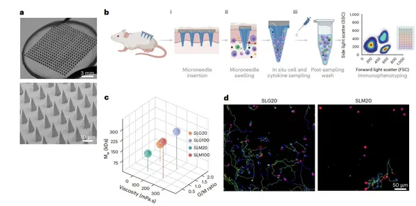 ความพิเศษอีกประการหนึ่งอยู่ที่ตัวเข็มไมโคร ซึ่งถูกเคลือบด้วยไฮโดรเจลชนิดพิเศษที่ทำจากอัลจิเนต (Alginate) สูตรเฉพาะที่ผ่านการคัดเลือกมาแล้วว่ามีคุณสมบัติทางกายภาพที่เหมาะสมที่สุด เมื่อแผ่นแปะสัมผัสกับผิวหนัง ไฮโดรเจลจะดูดซับของเหลวจากเนื้อเยื่อและพองตัวขึ้น สร้างโครงสร้างที่มีรูพรุนเอื้อให้เซลล์ภูมิคุ้มกันที่ถูกเรียกมารวมตัวกันนั้น สามารถเคลื่อนที่ออกจากเนื้อเยื่อและแทรกตัวเข้ามาติดอยู่ในชั้นเจลของแผ่นแปะได้ ผลการทดลองในหนูทดลองพิสูจน์ให้เห็นว่า วิธีการนี้สามารถดักจับเซลล์ภูมิคุ้มกันที่มีชีวิตได้จำนวนมาก รวมถึงสามารถตรวจพบเซลล์หายากที่มีความจำเพาะต่อแอนติเจน ซึ่งปกติแล้วมักจะหลุดรอดสายตาไปในการตรวจเลือดแบบดั้งเดิมเนื่องจากมีปริมาณน้อยมากในกระแสเลือด