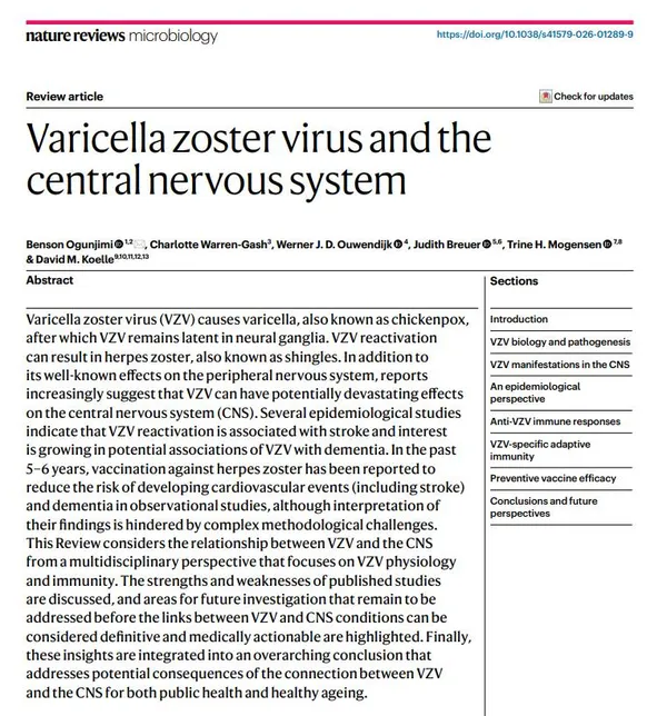 เมื่อพูดถึงโรคอีสุกอีใสหรืองูสวัด หลายคนอาจคิดว่าเป็นเพียงโรคผิวหนังที่หายเองได้ แต่สิ่งที่คนส่วนใหญ่ไม่รู้คือ ไวรัสที่เป็นสาเหตุของโรคทั้งสองนี้ซึ่งมีชื่อว่า Varicella Zoster Virus หรือ VZV อาจมีความเกี่ยวข้องกับโรคร้ายแรงในสมองอย่างโรคหลอดเลือดสมองและโรคสมองเสื่อมด้วย บทความนี้จากวารสาร Nature Reviews Microbiology ได้รวบรวมและวิเคราะห์องค์ความรู้เพื่อตอบคำถามว่า VZV เกี่ยวข้องกับสมองอย่างไร ตั้งแต่ชีววิทยาของไวรัส หลักฐานทางระบาดวิทยา ไปจนถึงบทบาทของวัคซีน