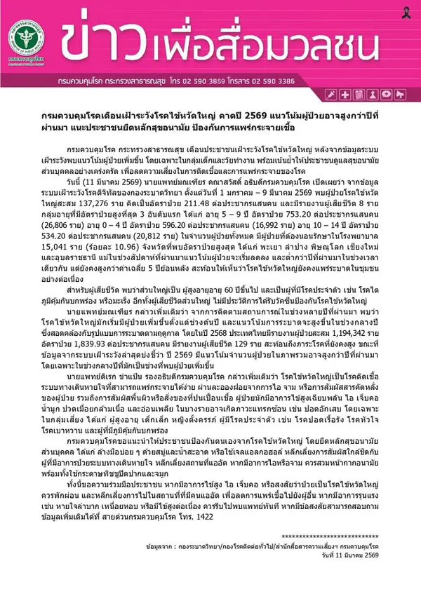 ขณะที่ข้อมูลจากระบบเฝ้าระวังล่าสุดบ่งชี้ว่า ปี 2569 มีแนวโน้มจำนวนผู้ป่วยในภาพรวมอาจสูงกว่าปีที่ผ่านมา โดยเฉพาะในช่วงกลางปีที่มักเป็นช่วงที่พบผู้ป่วยเพิ่มขึ้น