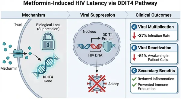 เมื่อนักวิจัยนำยาเมตฟอร์มินไปทดสอบกับเซลล์เม็ดเลือดขาวที่เก็บมาจากผู้ติดเชื้อ HIV ที่กินยาต้านไวรัสมาอย่างยาวนาน พบว่ายาเมตฟอร์มินสามารถลดการการกลับมาแบ่งตัวของไวรัสที่ซ่อนอยู่ในเซลล์ของผู้ป่วยได้สูงถึงเฉลี่ยร้อยละ 51 นอกจากความสามารถในการสะกดไวรัสให้สงบแล้ว ยาเมตฟอร์มินยังมีข้อดีอื่นๆ ที่เป็นประโยชน์ต่อผู้ติดเชื้อ HIV อีกด้วย เช่น ช่วยลดภาวะการอักเสบเรื้อรังในร่างกาย ช่วยลดความอ่อนล้าของเซลล์ภูมิคุ้มกัน และอาจช่วยชะลอความเสื่อมสภาพของเซลล์