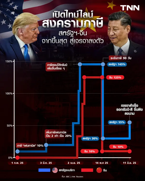 ก่อนที่วันที่ 14 พ.ค. 2025 ทั้งสองประเทศจะระงับการขึ้นภาษีเป็นเวลา 90 วันเพื่อรอการเจรจา จนกระทั่งวันที่ 11 มิ.ย. 2025 สหรัฐฯ และจีน เจรจาได้ลงตัว เป็นสหรัฐฯ ขึ้นภาษีจีน 55%% ส่วนจีนอยู่ที่ 10% โดยเหลือเพียงทรัมป์ และประธานาธิบดีสี จิ้นผิง ลงนามอนุมัติ