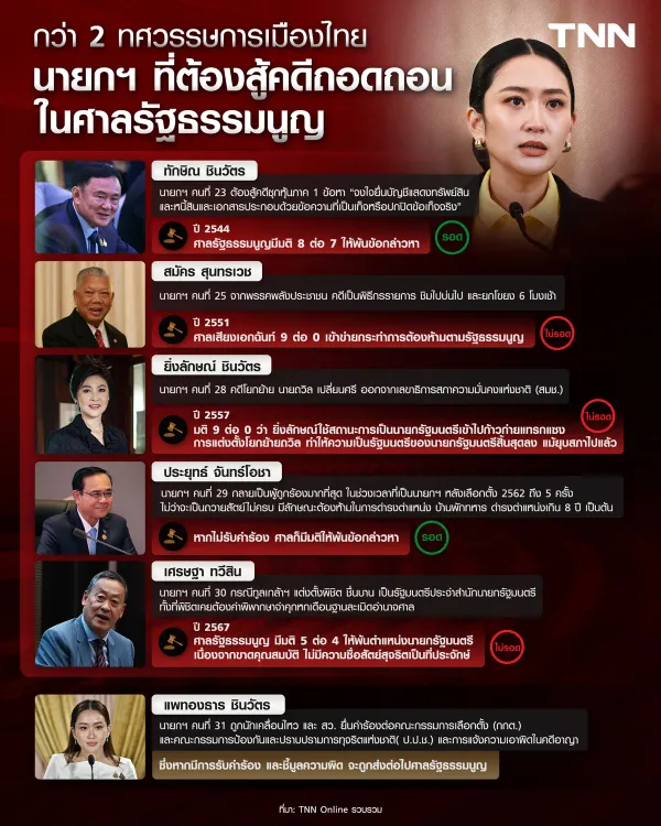 โดยกว่า 2 ทศวรรษการเมืองที่ผ่านมา ก็มีนายกฯ หลายคนที่ถูกร้องเรียนในคดีต่างๆ ซึ่งก็มีทั้งที่รอด และถูกตัดสินให้ออกจากตำแหน่งด้วย