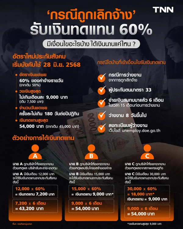 อัตราเงินทดแทนประกันสังคม สำหรับผู้ประกันตนมาตรา 33 ที่ถูกนายจ้างเลิกจ้าง ปรับเพิ่มจาก 50% ของเงินเดือน เป็น 60% นาน 180 วัน