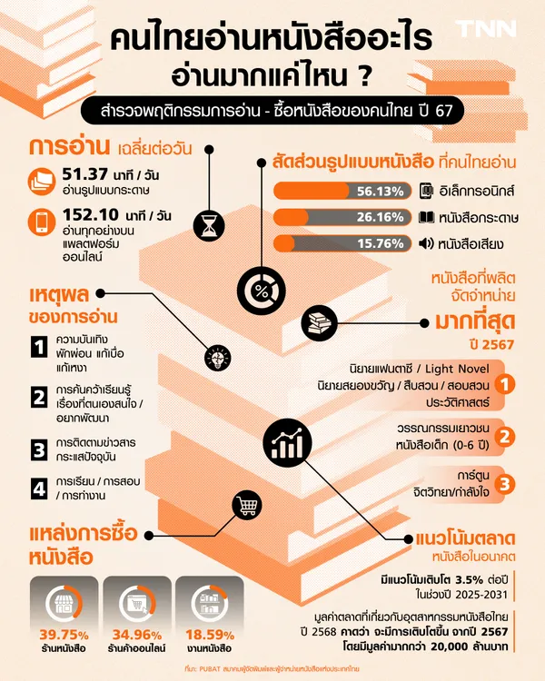 PUBAT สมาคมผู้จัดพิมพ์และผู้จำหน่ายหนังสือแห่งประเทศไทย ได้จัดทำข้อมูลสถิติงานหนังสือปี 2568 ซึ่งรวมถึงการสํารวจพฤติกรรมการอ่าน-ซื้อหนังสือของคนไทย ปี 67