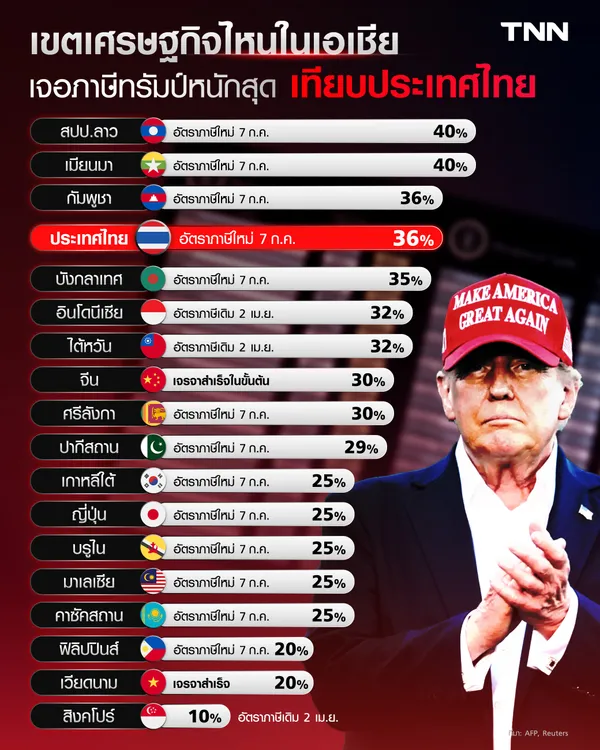 หากมองแค่ประเทศหรือเขตเศรษฐกิจในเอเชีย สปป.ลาว และเมียนมา ถือว่าเจอภาษีสูงสุดที่ 40% รองลงมาคือกัมพูชาและไทย เจอภาษี 36%