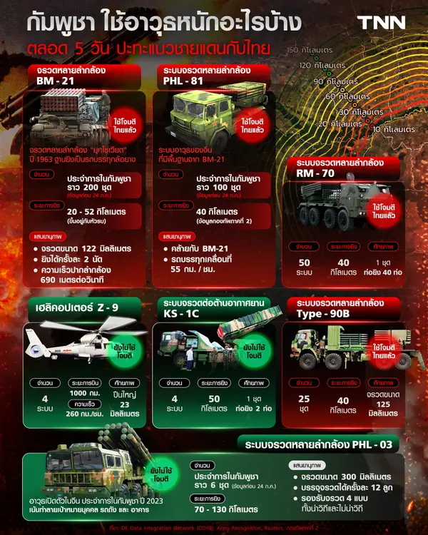 โดยเฉพาะ จรวดหลายลำกล้อง Bm-21 ที่มีการถูกพูดถึงบ่อยครั้ง และโจมตีแบบไม่เลือกมายังเป้าหมายพลเรือนด้วย โดยฐานข้อมูลพบว่า กัมพูชามีจรวดหลายลำกล้องรุ่นนี้ราว 200 ชุด และมีพิสัยการยิง 20-52 กิโลเมตร ขึ้นอยู่กับหัวรบที่ใช้