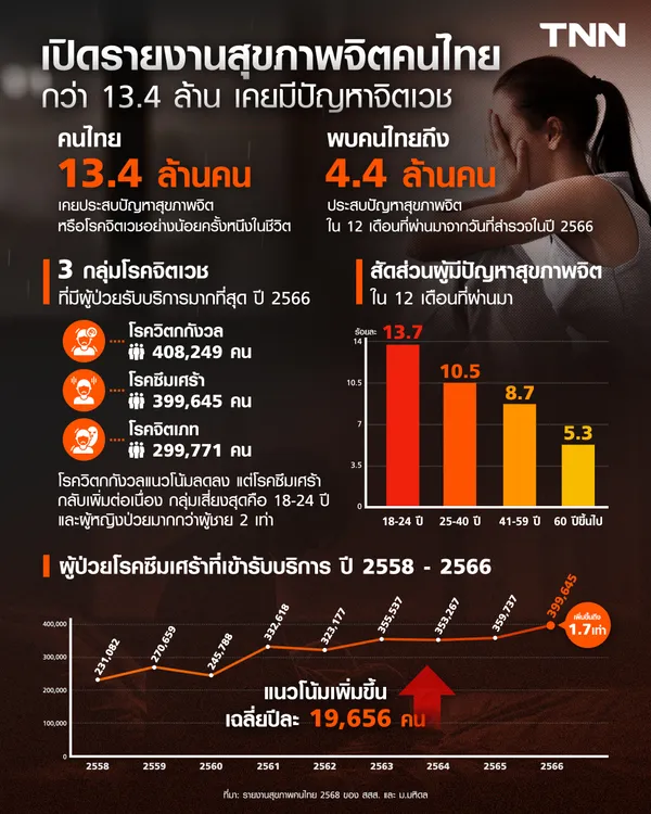 จากรายงานสุขภาพคนไทย 2568 ของ สสส. และมหาวิทยาลัยมหิดล พบว่า คนไทยกว่า 13.4 ล้านคน เคยประสบปัญหาสุขภาพจิตหรือโรคจิตเวชอย่างน้อยหนึ่งครั้งในชีวิต และในรอบ 12 เดือนที่ผ่านมา มีคนไทยถึง 4.4 ล้านคน ที่เผชิญปัญหาสุขภาพจิต กลุ่มโรคจิตเวชที่มีผู้ป่วยเข้ารับบริการมากที่สุดคือ โรควิตกกังวล 408,249 คน รองลงมาคือ โรคซึมเศร้า 399,645 คน และ โรคจิตเภท 299,771 คน แม้โรควิตกกังวลจะมีแนวโน้มลดลง แต่โรคซึมเศร้ากลับเพิ่มขึ้นต่อเนื่อง โดยกลุ่มเสี่ยงสูงสุดคือคนอายุ 18-24 ปี และพบในเพศหญิงมากกว่าเพศชายถึง 2 เท่า
