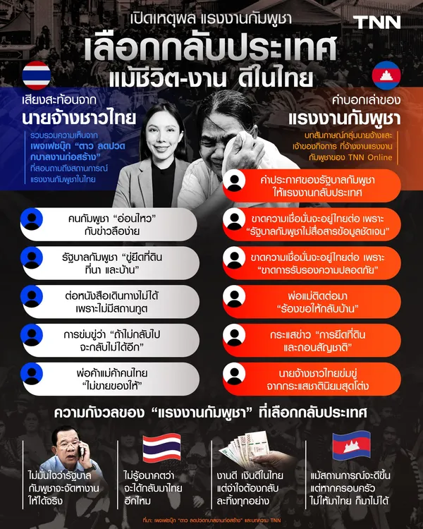ที่จ้างงานแรงงานกัมพูชา ของ TNN Online พบว่า เหตุผลคล้ายคลึงกัน แต่มีปัจจัยจากครอบครัวมาเพิ่ม คือ พ่อแม่ติดต่อมา “ร้องขอให้กลับบ้าน”, กระแสข่าว “การยึดที่ดิน และถอนสัญชาติ”