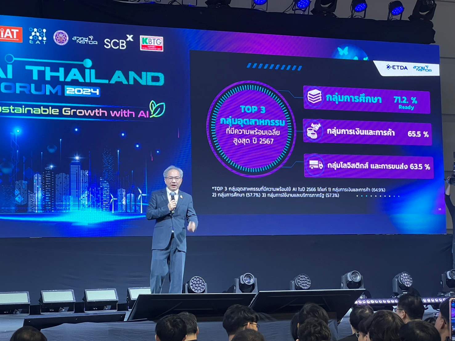 ที่งานมหกรรมด้านปัญญาประดิษฐ์ "AI Thailand Forum 2024" ศ.ดร.ชูกิจ ลิมปิจำนงค์ ผู้อำนวยการสำนักงานพัฒนาวิทยาศาสตร์และเทคโนโลยีแห่งชาติ (สวทช.) ในฐานะเลขานุการคณะกรรมการขับเคลื่อนแผนปฏิบัติการด้านปัญญาประดิษฐ์(เอไอ) แห่งชาติเพื่อการพัฒนาประเทศไทย กล่าวถึงการดำเนินงานขับเคลื่อนแผน AI แห่งชาติตามแผนยุทธศาสตร์ในด้านต่าง ๆ ในปีที่ผ่านมาได้สะท้อนผ่านการจัดอันดับดัชนีความพร้อมด้านปัญญาประดิษฐ์ของรัฐบาล (AI Government Readiness Index) ปี 2566 ที่ประเทศไทยยังคงรักษาตำแหน่งในกลุ่ม 40 อันดับแรกของโลก ท่ามกลางการแข่งขันที่เข้มข้นขึ้นและจำนวนประเทศที่เข้าร่วม การจัดอันดับที่เพิ่มขึ้น โดยอยู่ในลำดับที่ 37 จาก 193 ประเทศ แม้จะปรับตัวลง 6 อันดับจากปีก่อนที่อยู่ในลำดับที่ 31 จาก 181 ประเทศ เมื่อพิจารณาในรายละเอียด พบว่าไทยมีจุดแข็งในด้านภาครัฐที่ได้ 77.21 คะแนน และด้านโครงสร้างพื้นฐานที่ได้ 70.55 คะแนน สะท้อนความพร้อมของกลไกภาครัฐและระบบโครงสร้างพื้นฐานในการรองรับการพัฒนา AI ขณะที่ด้านเทคโนโลยีได้ 41.33 คะแนนซึ่งสูงขึ้นจากปีก่อน แต่ก็ยังเป็นส่วนสำคัญที่ไทยต้องเพิ่มการพัฒนาต่อยอดเพื่อยกระดับขีดความสามารถด้าน AI ในองค์รวมของประเทศในระยะต่อไป