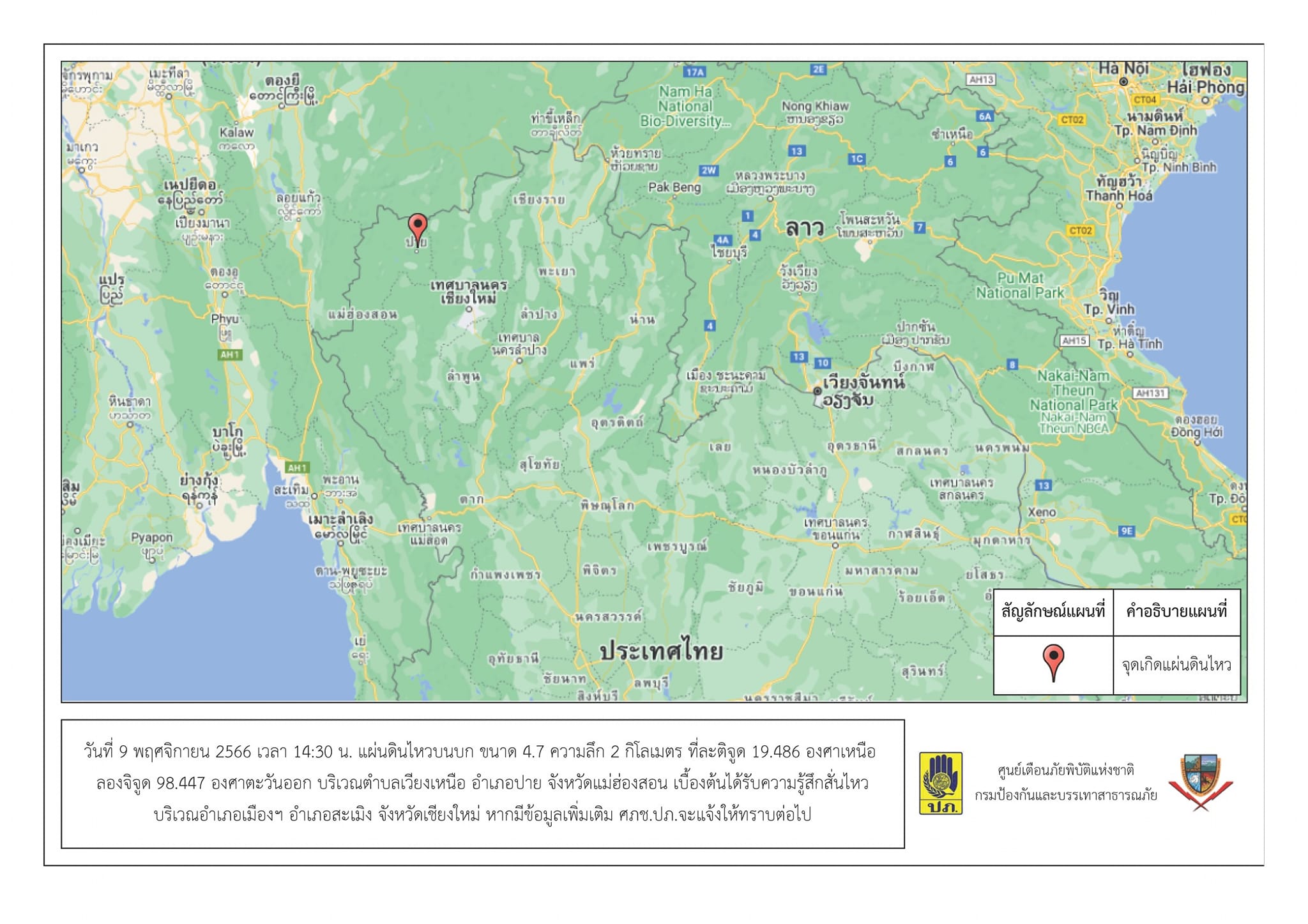 วันนี้ (9 พ.ย.66) กรมป้องกันและบรรเทาสาธารณภัย (ปภ.) รายงานเมื่อเวลา 14.30 น. เกิดแผ่นดินไหว ขนาด 4.7 ความลึก 2 กิโลเมตร บริเวณตำบลเวียงเหนือ อำเภอปาย จังหวัดแม่ฮ่องสอน