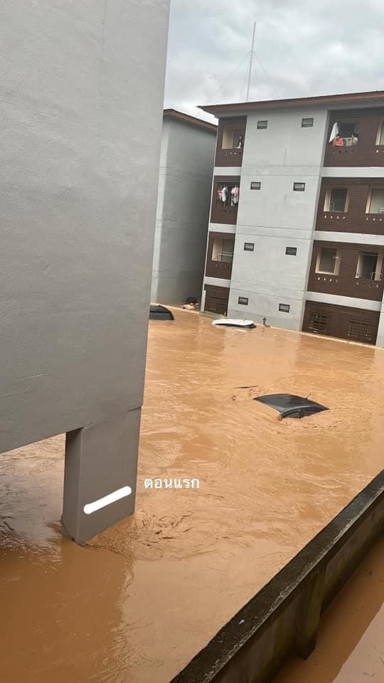 รถยนต์และรถจักรยานยนต์ ถูกน้ำท่วมจำนวนมาก โดยน้ำท่วมสูงระดับกว่า 1 -2 เมตร / นักศึกษาและชาวบ้านบางคน ก็ต้องรีบขนของขึ้นไปอยู่ที่สูง บ้างก็ไปอยู่บนหลังคาเพื่อความปลอดภัย เกรงว่าสถานการณ์น้ำจะรุนแรงมากขึ้น และรอการช่วยเหลือจากเจ้าหน้าที่