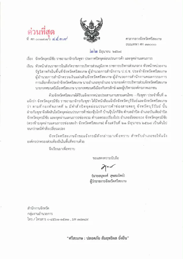 ขณะเดียวกัน ผู้ว่าราชการจังหวัดศรีสะเกษได้ออกหนังสือแจ้งไปยังหัวหน้าส่วนราชการต่างๆ ว่าจังหวัดได้รับการแจ้งเตือนจากหน่วยประสานงานชายแดนไทย–กัมพูชา ประจำพื้นที่ 1 ว่า จังหวัดอุดรมีชัย ประเทศกัมพูชา ได้ส่งหนังสืออย่างเป็นทางการมายังฝ่ายไทย แจ้งปิดจุดผ่อนปรนการค้าช่องจับโกกี (ตรงข้ามด่านสายตะกู จ.บุรีรัมย์) และจุดผ่านแดนช่องจวม (ตรงข้ามช่องสะงำ จ.ศรีสะเกษ) มีผลตั้งแต่วันที่ 21 มิถุนายน 2568 เป็นต้นไป จนกว่าจะมีคำสั่งเปลี่ยนแปลง