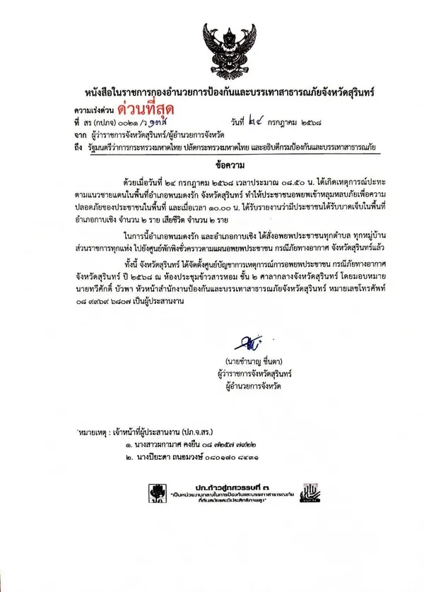สำนักงานประชาสัมพันธ์จังหวัดสุรินทร์ แจ้งว่า นายชำนาญ ชื่นตา ผู้ว่าราชการจังหวัดสุรินทร์ ได้สั่งการจัดตั้งศูนย์บัญชาการเหตุการณ์จังหวัดสุรินทร์ เพื่ออพยพประชาชนอย่างเร่งด่วน หลังเกิดเหตุปะทะตามแนวชายแดนไทย–กัมพูชา ในพื้นที่อำเภอพนมดงรัก จังหวัดสุรินทร์ ส่งผลให้ประชาชนในหมู่บ้านใกล้เคียงต้องอพยพเข้าสู่พื้นที่ปลอดภัย