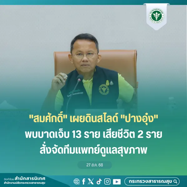 นายสมศักดิ์ เทพสุทิน รัฐมนตรีว่าการกระทรวงสาธารณสุข กล่าวถึงกรณีเหตุการณ์ดินสไลด์ทับบ้านเรือนประชาชนที่บ้านปางอุ๋ง หมู่ 1 ต.แม่ศึก อ.แม่แจ่ม จ.เชียงใหม่ ว่า ได้รับรายงานจากกองสาธารณสุขฉุกเฉินถึงผลกระทบจากพายุโซนร้อนคาจิกิ ทำให้มีฝนตกหนักและเกิดเหตุดินสไลด์ดังกล่าวเมื่อช่วงเวลาประมาณ 01.00 น. ที่ผ่านมา ทำให้มีบ้านเรือนประชาชนได้รับความเสียหายทั้งหลังประมาณ 10 หลังคาเรือน และเสียหายบางส่วน 33 หลังคาเรือน